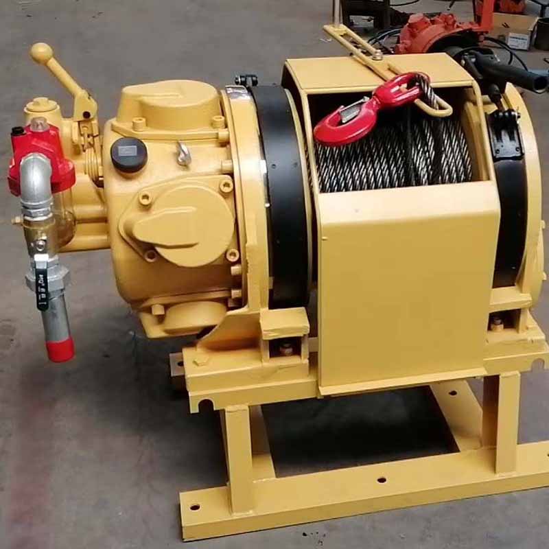 工作原理:压缩空气通过进气阀进入气动马达的气缸,推动活塞运动,活塞的往复运动经连杆转化为曲轴的旋转运动,再通过输出轴将动力传递给卷筒。卷筒缠绕或放开钢丝绳,从而实现重物的提升或下降。通过控制阀控制进入气动马达的气压和流量,可调节马达的转速和输出扭矩,进而控制绞车的运行速度和提升力量。